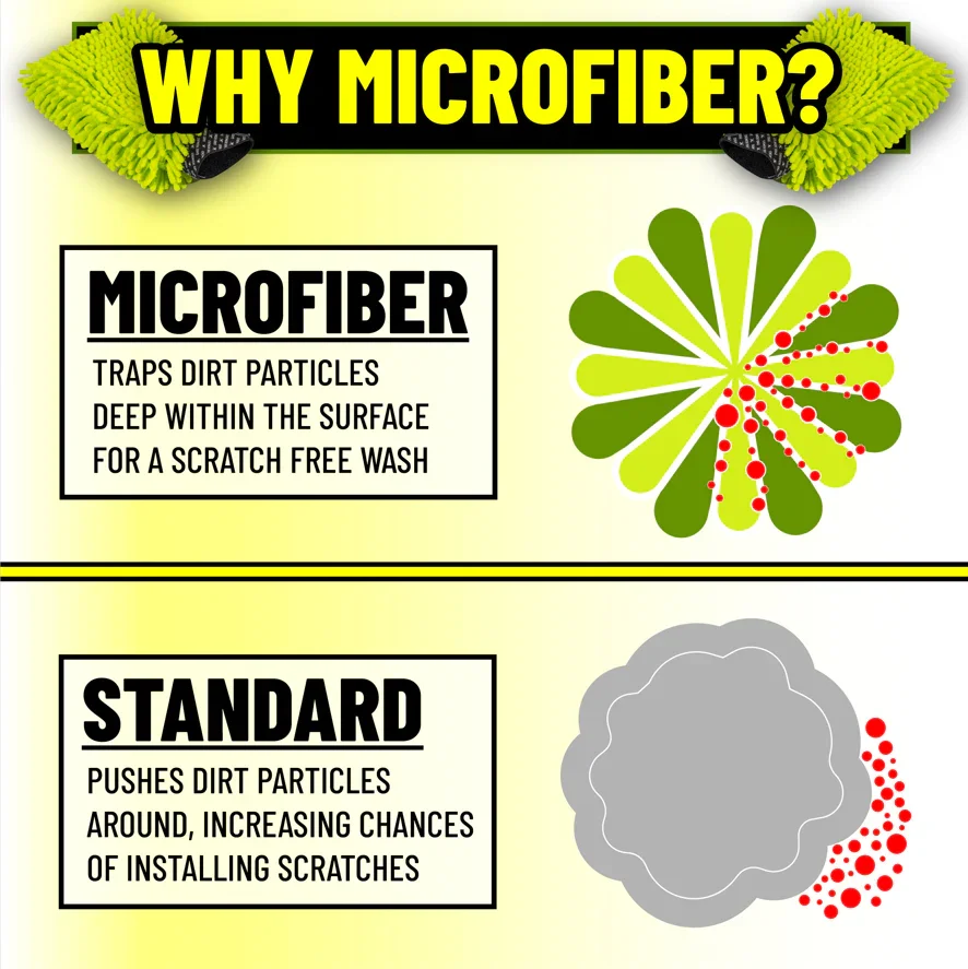 The Chenille Car Wash Mitt is made with premium 70/30 blended microfiber for extra-soft cleaning and wiping. Every fiber acts like a velcro hook and loop material, trapping and holding abrasive dirt and filth deep within the pile. This process insulates particles from paintwork, drastically reducing the chances of swirls or scratches.